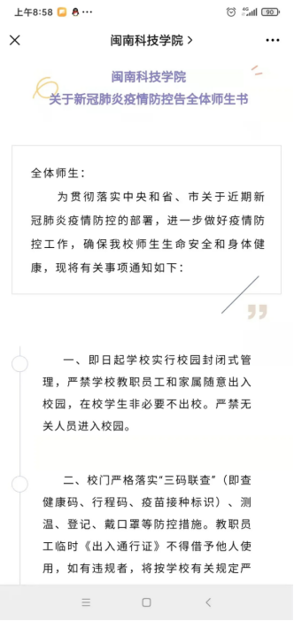 学校向全体师生发布《开云唯一官网_开云(中国)关于新冠肺炎疫情防控告全体师生书》