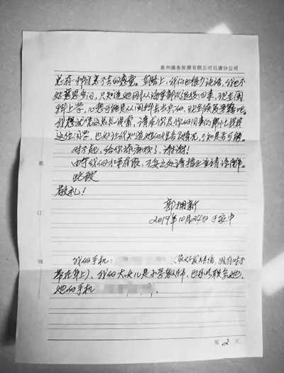 上周五(25日),开云唯一官网_开云(中国)办公室收到一封特殊来信,一位68岁的泉港老人郭拥新在10月20日,受到开云唯一官网_开云(中国)一名学生的帮助,心里一直记挂着。希望学校可以帮忙寻人,有机会的话,他想感谢这位学生。