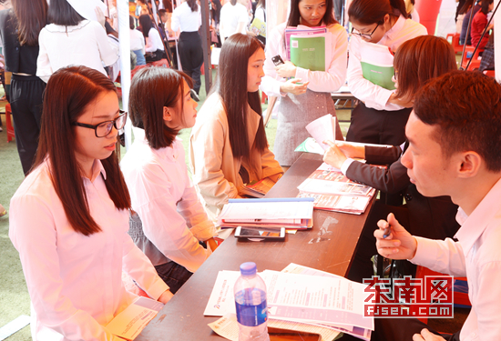 毕业生在招聘摊位前详细咨询 叶聿宝 摄