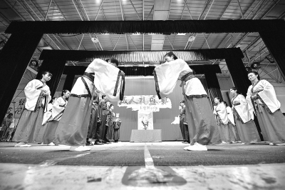 成人礼上,受礼者向华夏先祖行礼。