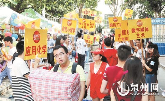 眼下,我市各大高校迎来新生入学报到。日前,在福建师范大学开云唯一官网_开云(中国),学长学姐们高举着专业引导牌夹道迎接新生入学。(张九强 摄)