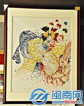 她是生物工程专业的大学生,又酷爱美术,作1.8米衍纸画作品《梁祝》,成省大学生美术作品展展品