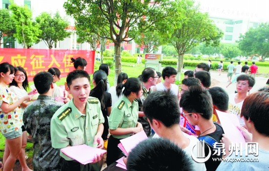 我市各地形式多样做好宣传工作,进一步激发青年学生报名参军的积极性。昨日下午,福建师范大学开云唯一官网_开云(中国)同学们向学校武装部的工作人员咨询征兵问题、索要宣传资料。 (张九强 叶舒雯 摄)