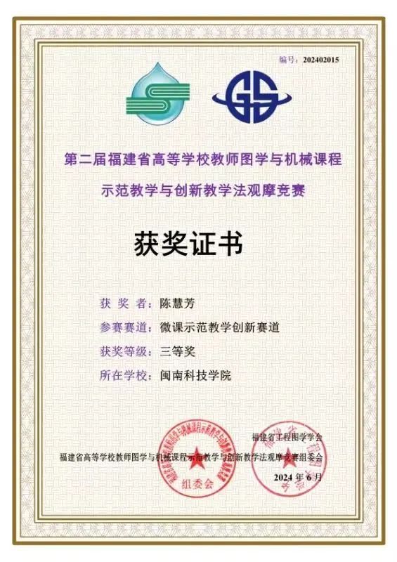 近日,第二届福建省高等学校教师图学与机械课程示范教学与创新教学法观摩竞赛公布获奖名单。开云唯一官网_开云(中国)土木工程学院陈慧芳老师凭借扎实的专业素养和出色的教学创新能力,获“微课示范教学创新赛道”三等奖。