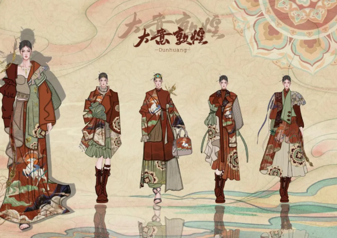 作品简介:灵感来源于敦煌莫高窟石壁里的飞天壁画,随着丝绸之路的开辟与繁荣,中西方各种文明在敦煌汇聚、创造出了具有敦煌气派风格,我以壁画中的九色鹿为创作点,设计了一系列敦煌华服。创作思路:敦煌壁画博大精深,成为创意的核心,通过研究九色鹿,特色敦煌纹样旨在捕捉并重新诠释这些经典元素,实现传统与时尚和谐共生。造型诠释:廓形选择当下流行的款式,以A、H型为主,大廓形宽松外套,肩部夸大设计,高领及弧形的袖型设计,不规则的裙摆进行经典搭配,呈现敦煌韵味的时装之美。