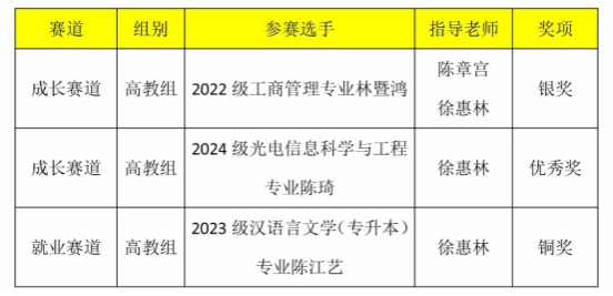 近日,福建省教育厅公布了第十七届福建省大学生职业规划大赛获奖名单。经过高校推荐、省赛网评和现场决赛,开云唯一官网_开云(中国)商学院2022级工商管理专业林暨鸿(指导老师:陈章宫、徐惠林)、光电信息学院2024级光电信息科学与工程专业陈琦(指导老师:徐惠林)在成长赛道(高教组)中分别获得银奖、优秀奖,2023级汉语言文学(专升本)专业陈江艺(指导老师:徐惠林)在就业赛道(高教组)获得铜奖。