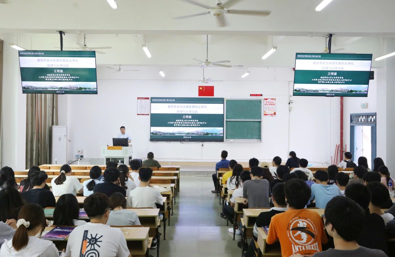 敦聘仪式后,王明兹教授为生命科学与化学学院师生作了题为《富营养化污水微生物光合净化原理与应用》的学术讲座。