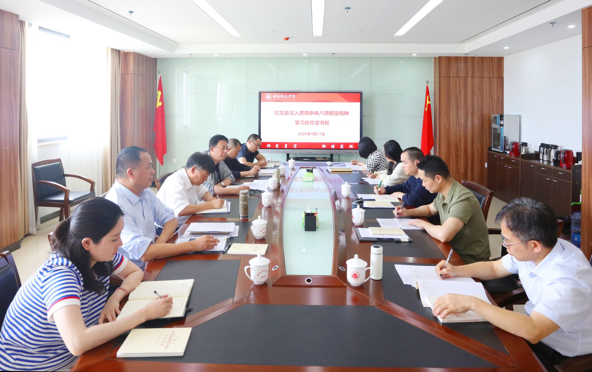 4月17日上午,校党委开展深入贯彻中央八项规定精神学习教育读书班集体学习活动,专题学习中央八项规定及其实施细则精神。校党委书记李旭同志主持学习会并作总结讲话。党员校领导、校长助理,校党委委员参加学习会。