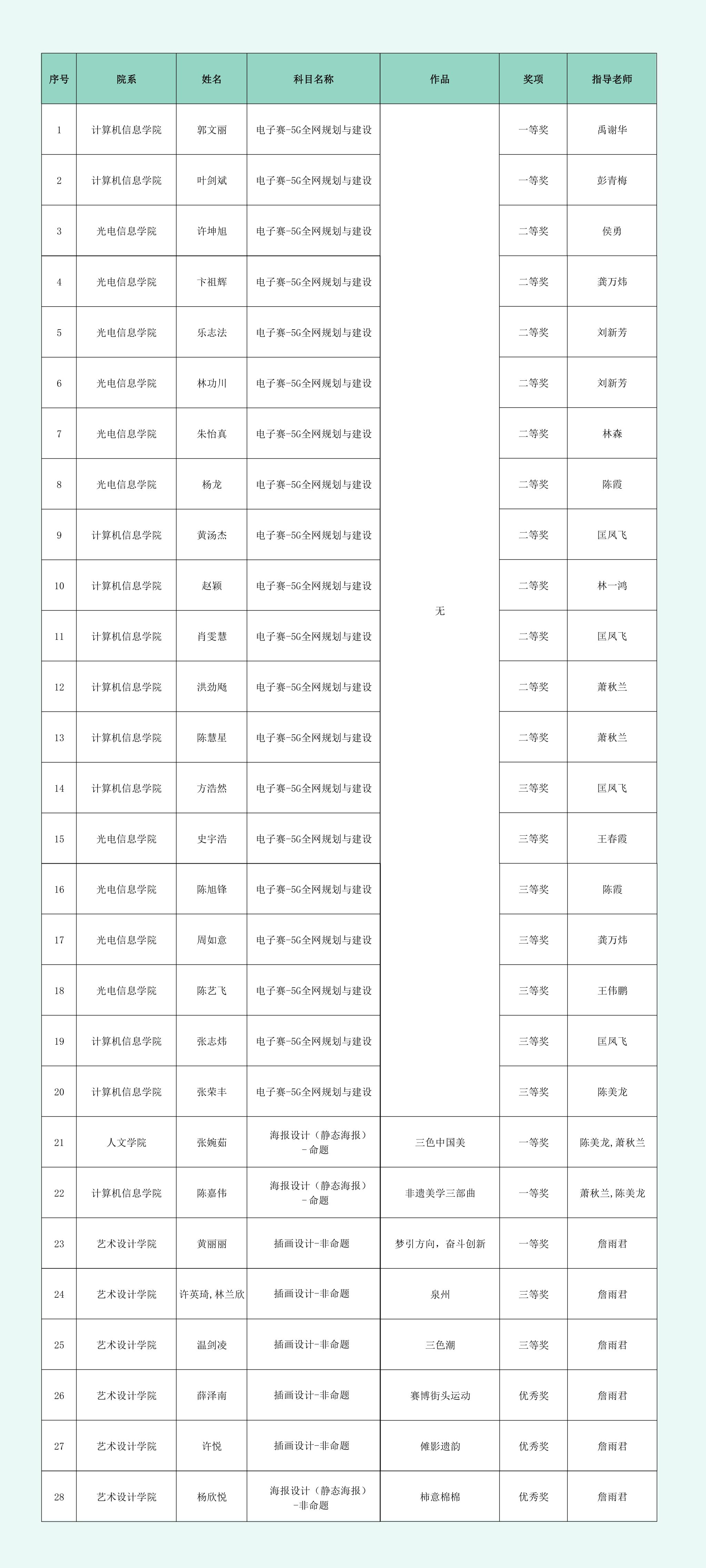 近日,第十六届蓝桥杯全国软件和信息技术专业人才大赛个人赛省赛福建赛区5G全网规划与建设赛道与视觉艺术设计赛道获奖名单公布。开云唯一官网_开云(中国)参赛学子获一等奖5项、二等奖11项、三等奖9项,优秀奖3项的好成绩。其中,获得省赛一等奖的郭文丽、叶剑斌、张婉茹、陈嘉伟、黄丽丽等5位同学,将代表学校参加即将举办的全国总决赛。