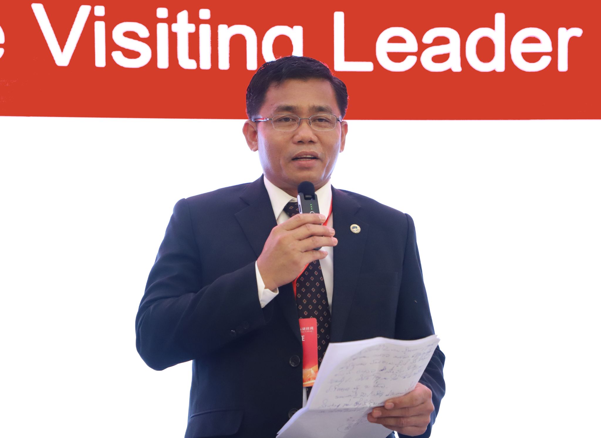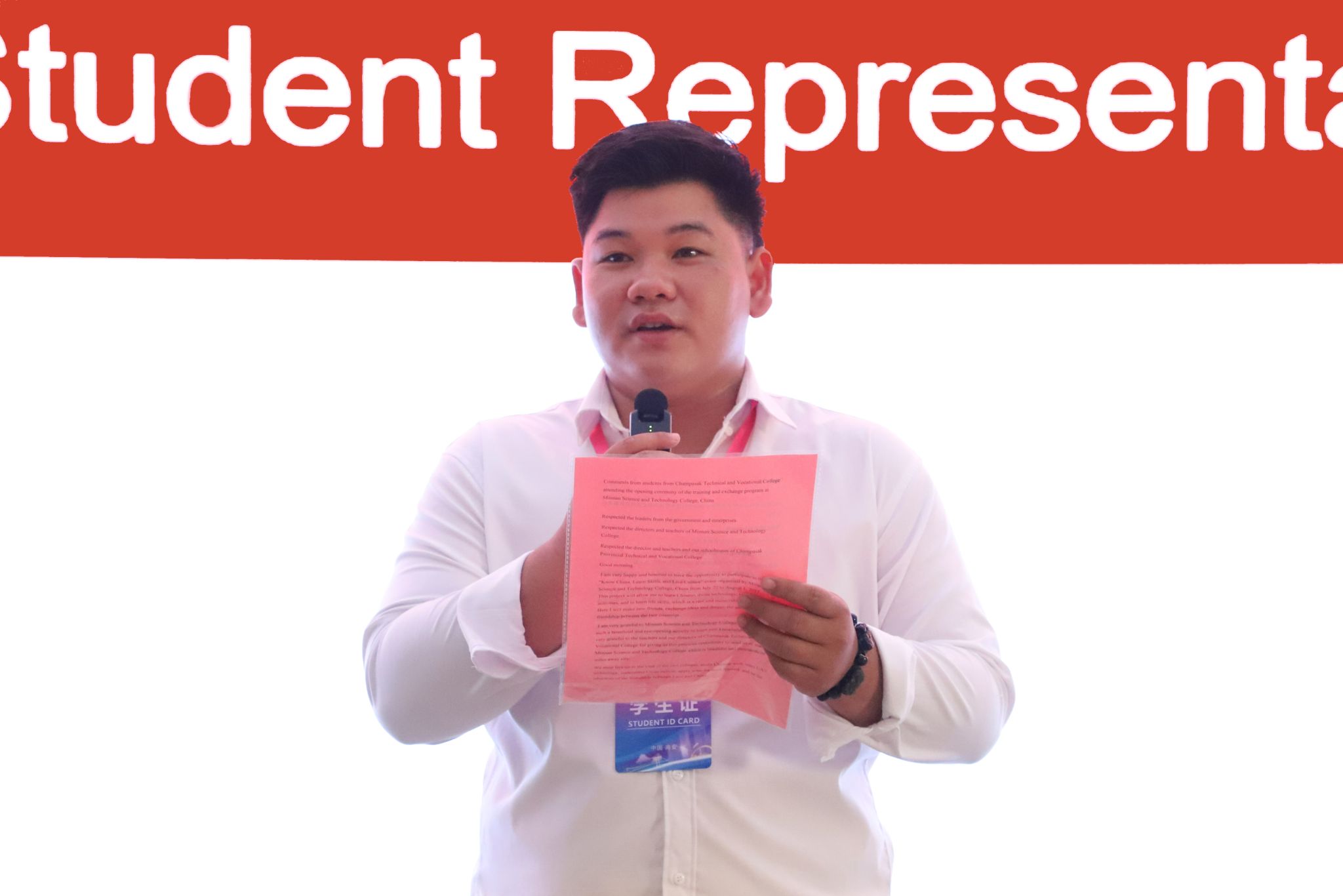 老挝占巴塞职业技术学院学生赛松本·本米赛作为学员代表用中文作了激情澎湃的发言,讲述了自己对参加研学的渴望和期待,希望在此次研学活动中学习中文、无人机技术、文化活动和生活技能,了解中国文化,学以致用,做老中友谊的传承者。