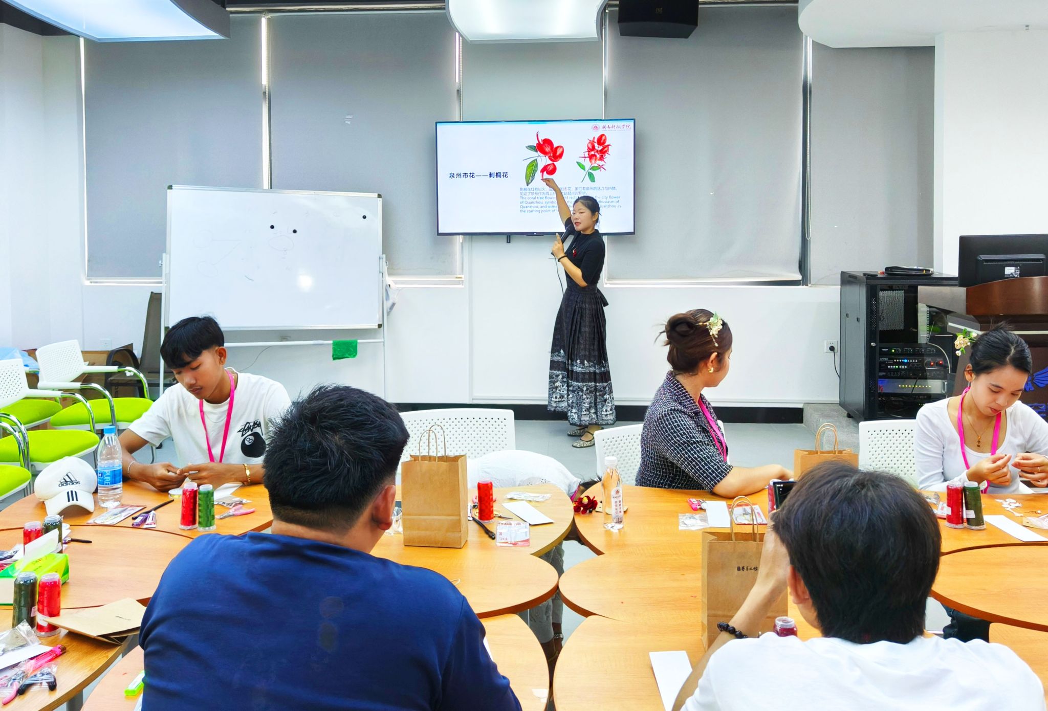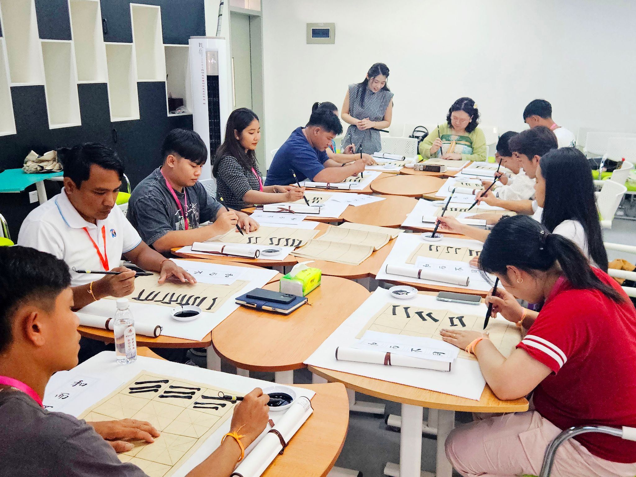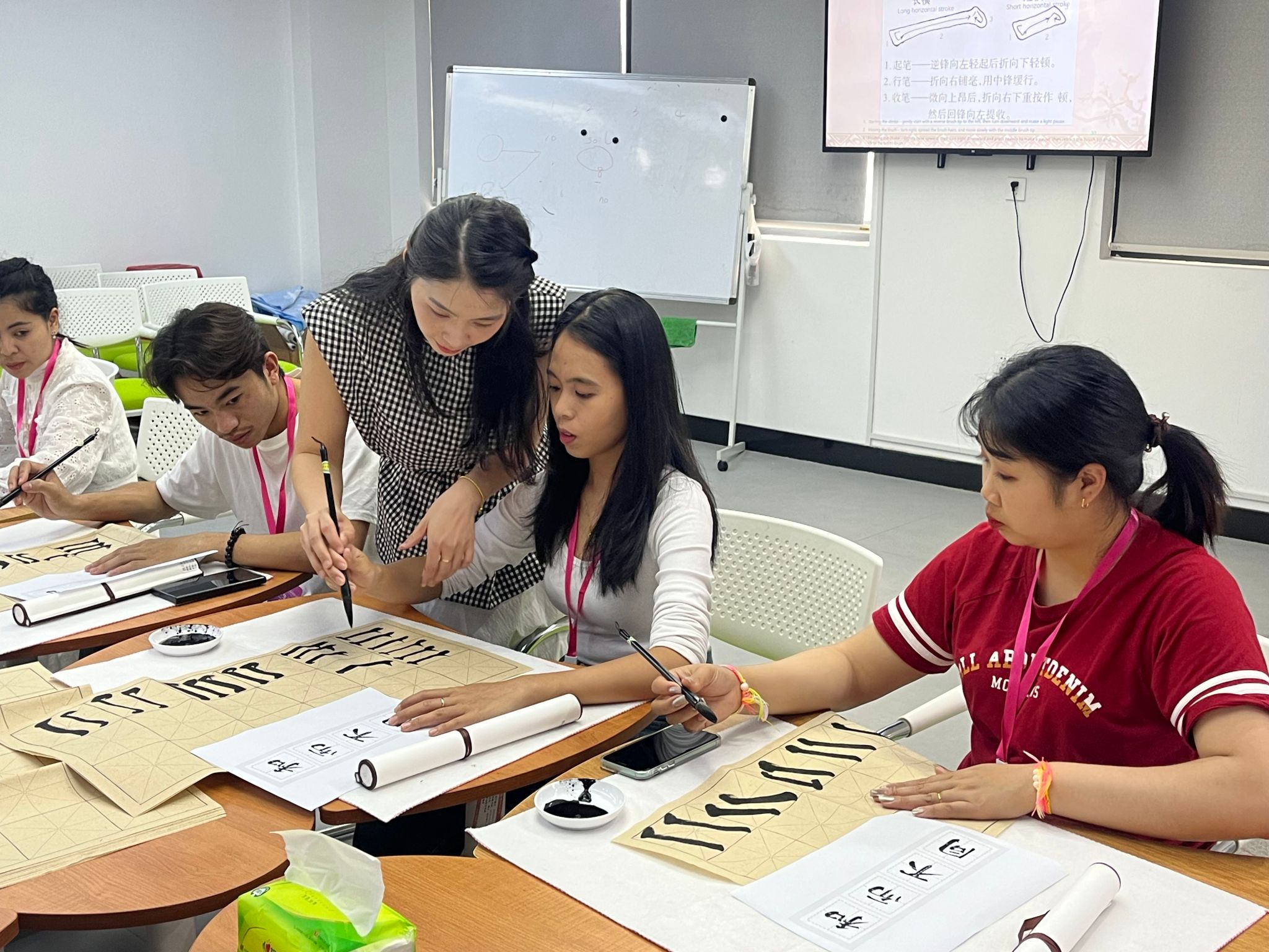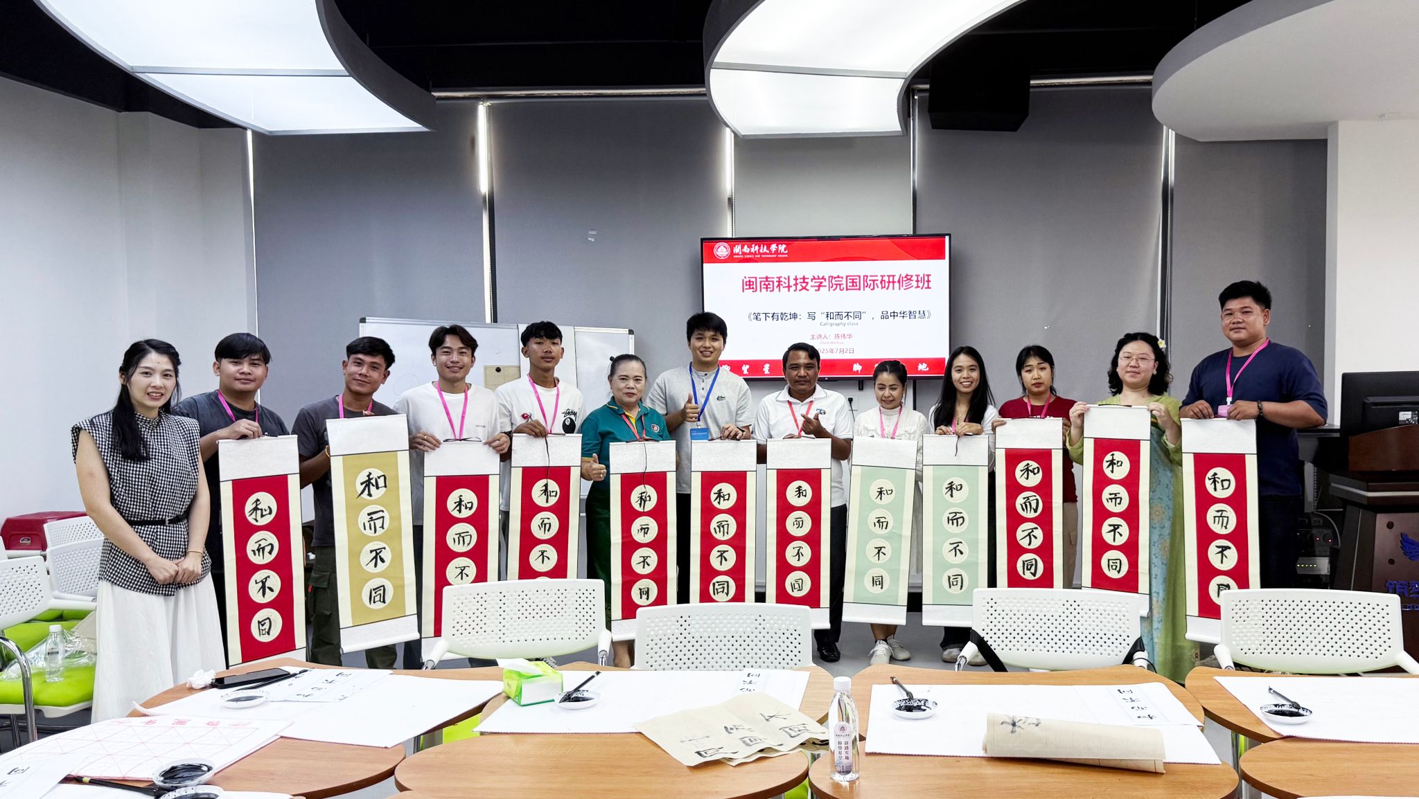 活动中,学员们在人文学院教师的指导下,学习了涵盖拼音、日常用语等基础内容,辅以情景对话训练,还融入中文歌曲学唱和书法体验,既增添趣味,又帮助参加研学的学员们掌握汉字书写,提升中文表达与交流兴趣。
