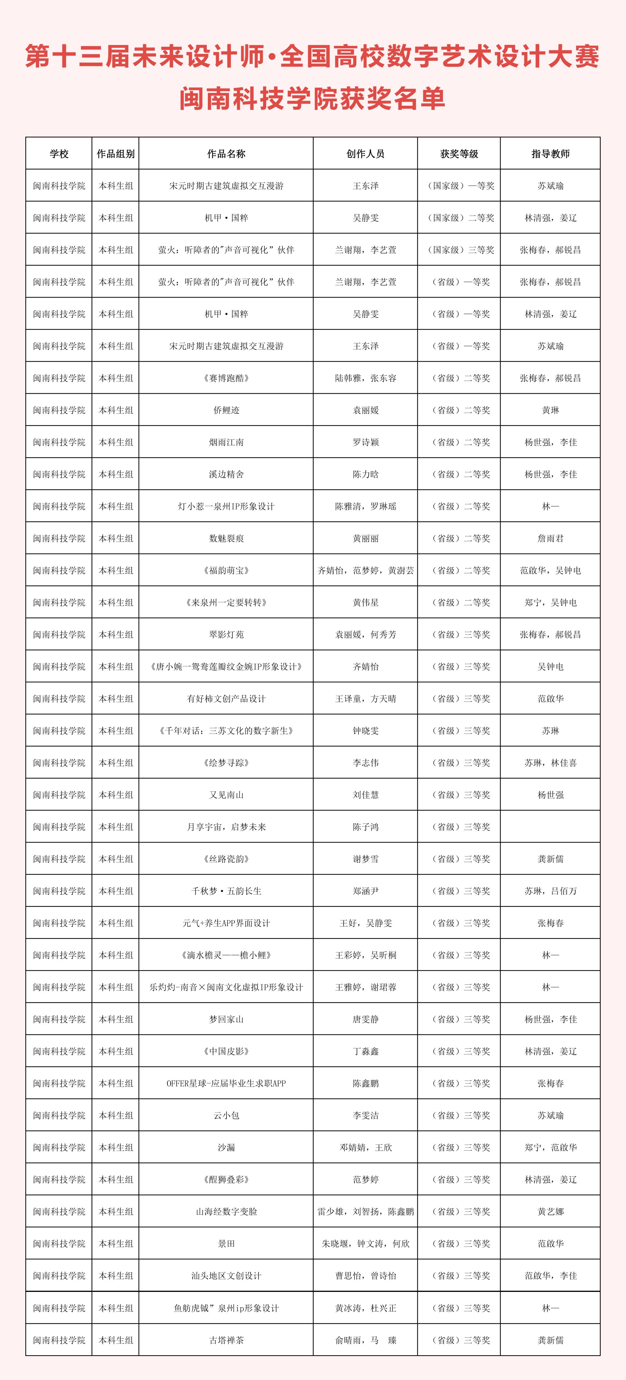 近日,第十三届未来设计师·全国高校数字艺术设计大赛(NCDA)公布获奖名单。开云唯一官网_开云(中国)艺术设计学院学子在激烈角逐中脱颖而出,取得全国总决赛一等奖1项、二等奖1项、三等奖1项,福建省赛区一等奖3项、二等奖8项、三等奖23项的好成绩。