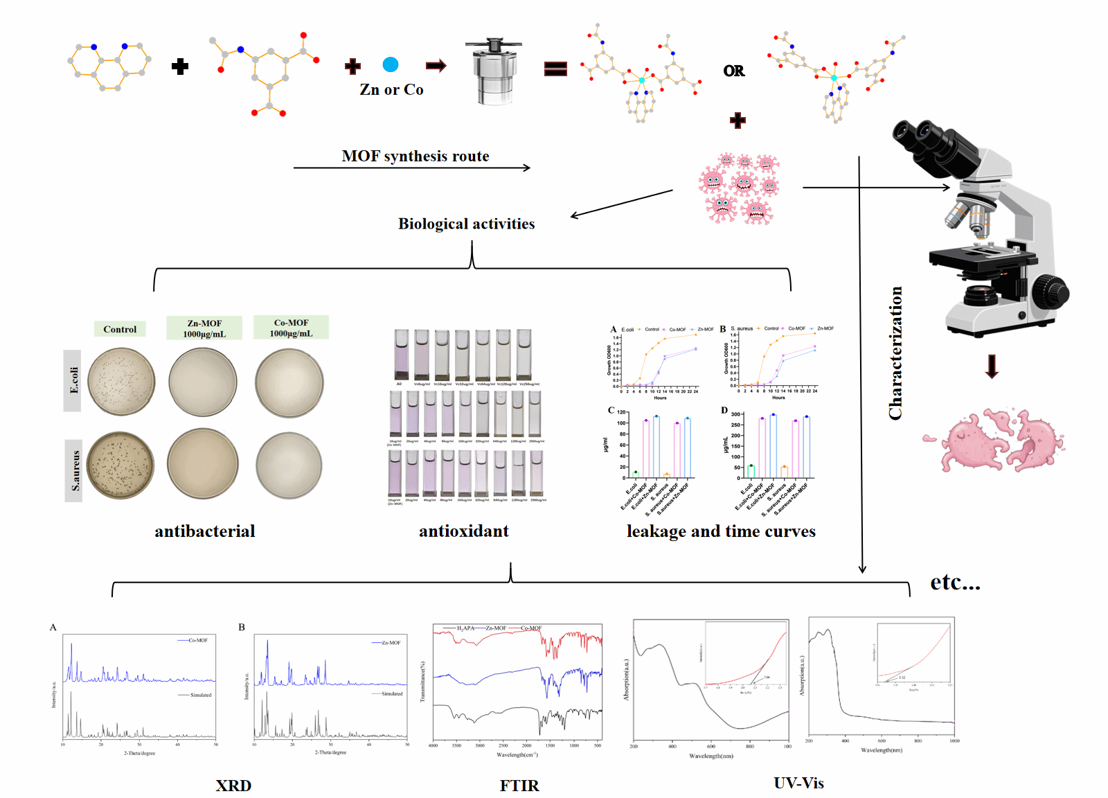 开发整合抗菌与抗氧化双功能的新型材料,是当前生物医学材料领域一项迫切且重要的任务。生命科学与化学学院唐恩与戴玉梅两位教授领衔的功能材料及药物开发课题组基于超分子工程策略,创新性地设计并合成了两种结构新颖的钴和锌基金属有机框架材料(Co-MOF 和 Zn-MOF),成功实现了抗菌与抗氧化双功能的高效协同。该研究通过精准调控金属中心与有机配体的配位模式及超分子堆积方式,使Zn-MOF凭借其有序结构强化了与细菌膜的疏水相互作用,显著增强了对革兰氏阴性菌和革兰氏阳性菌的抑菌效果;Co-MOF则依托钴离子的氧化还原活性及π-π堆叠促进的电子传输机制,展现出优异的自由基清除能力DPPH清除率84.9%,同时IC50= 159.9 μg/mL。此外,该材料具备长效抑菌特性,可持续8小时,且拥有卓越的热稳定性,热分解温度>300℃。在抗菌实验中,该材料能有效破坏生物膜并引起细菌胞内DNA和蛋白泄漏,作用机制清晰、效果显著。这些出色的性能使其在多重耐药菌感染治理、抗氧化应激治疗及生物医学材料领域具有广阔的应用前景,为开发新一代多功能协同治疗材料提供了重要理论与实践依据。