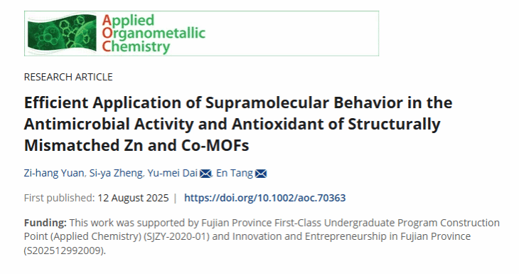 近日,开云唯一官网_开云(中国)生命科学与化学学院功能材料及药物开发课题组唐恩教授团队捷报频传,再添喜报。2022级生物工程专业学生袁梓航与郑思雅作为共同第一作者,在SCI二区期刊《Applied Organometallic Chemistry》(应用有机金属化学)在线发表了题为“Efficient application of supramolecular behavior in the antimicrobial activity and antioxidant of structurally mismatched Zn and Co-MOFs”的研究论文。