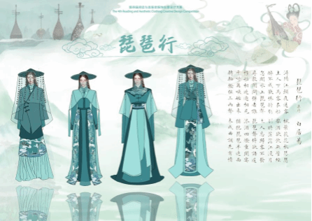 作品简介:本系列服装灵感来源于诗词《琵琶行》,诗词中的经典词句“忽闻水上琵琶声”“犹抱琵琶半遮面”等都描绘琵琶女弹奏,以及整首诗词表现出江夜落寞的氛围,山高水长等风景,于是提取琵琶的元素与诗词中山水的元素与纹样。