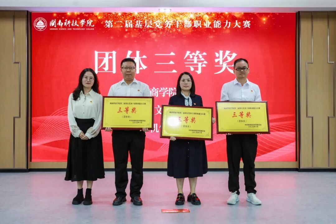 经过激烈角逐,生命科学与化学学院荣获团体一等奖,艺术设计学院、土木工程学院荣获团体二等奖;商学院、人文学院、计算机信息学院荣获团体三等奖。生命科学与化学学院、艺术设计学院、土木工程学院、生命科学与化学学院分别荣获“知识测试”“主题党日策划”“微党课”“谈心谈话”单项一等奖。