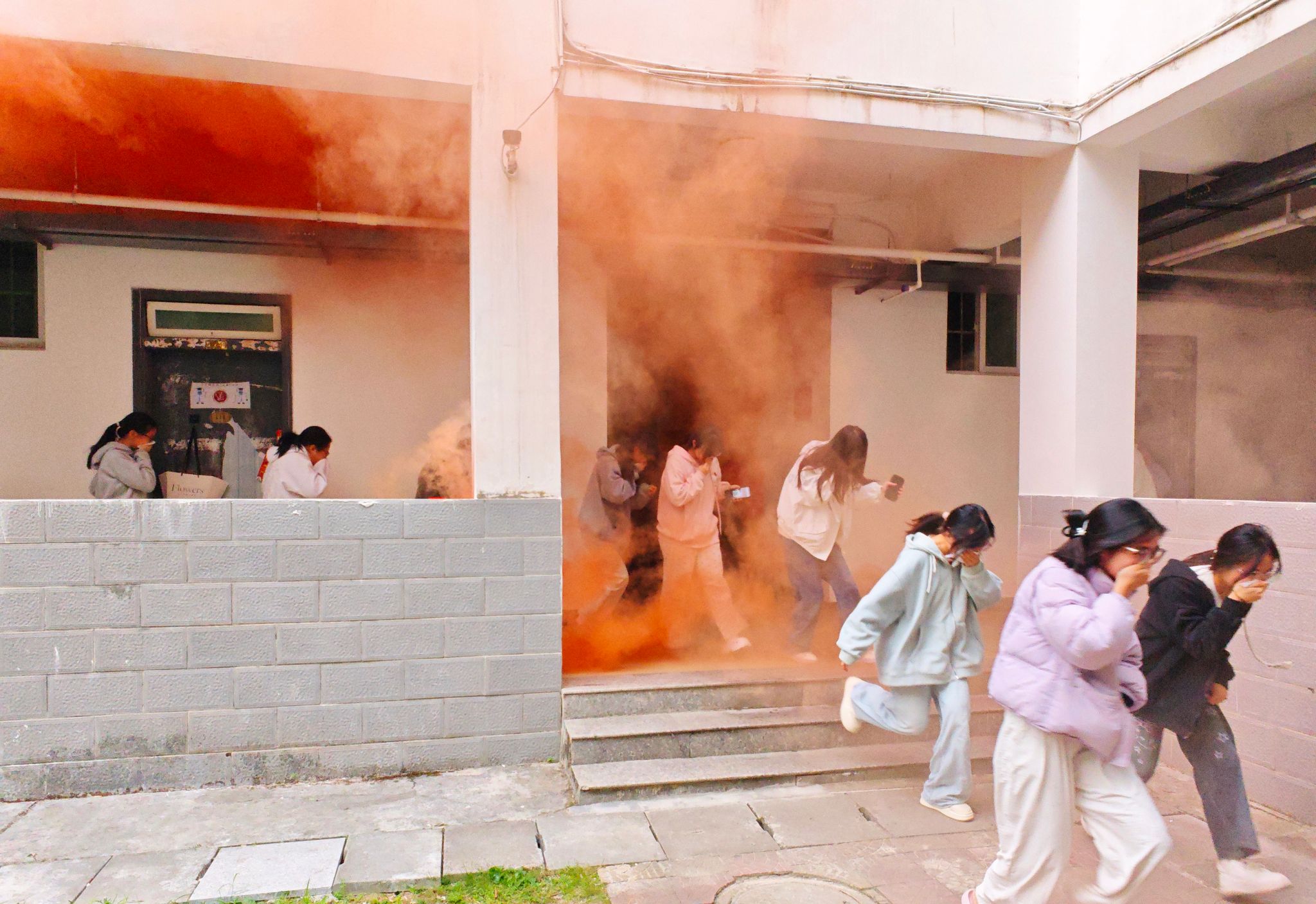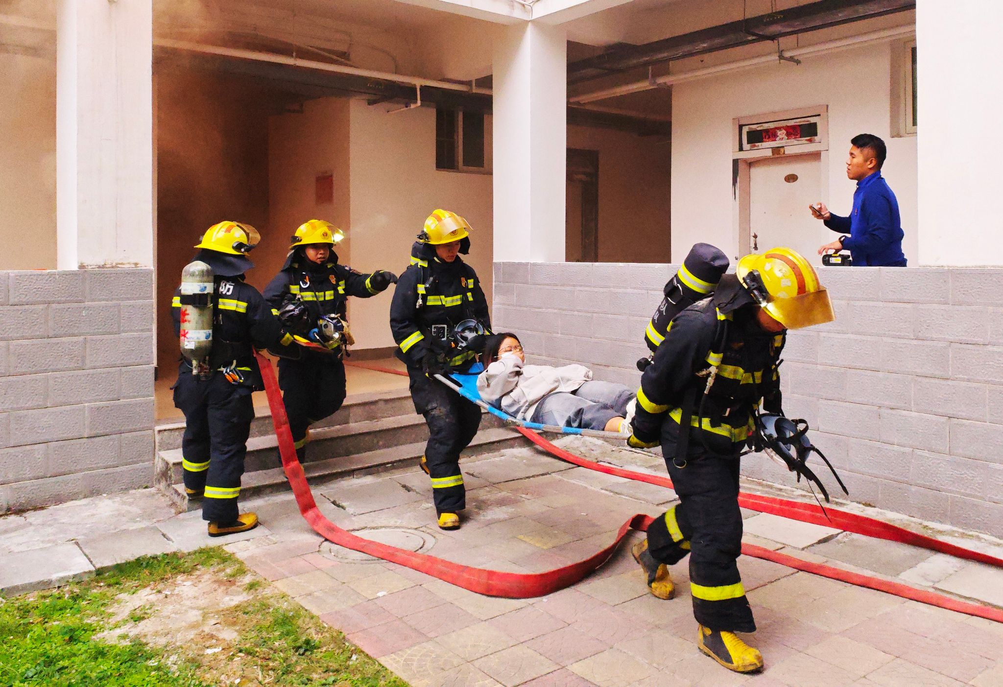 本次演练模拟学生宿舍突发火情,安保人员巡逻时第一时间发现险情,立即向学校保卫处及119火警电话报警。各应急小组迅速响应,立即启动应急预案,赶往现场展开处置。