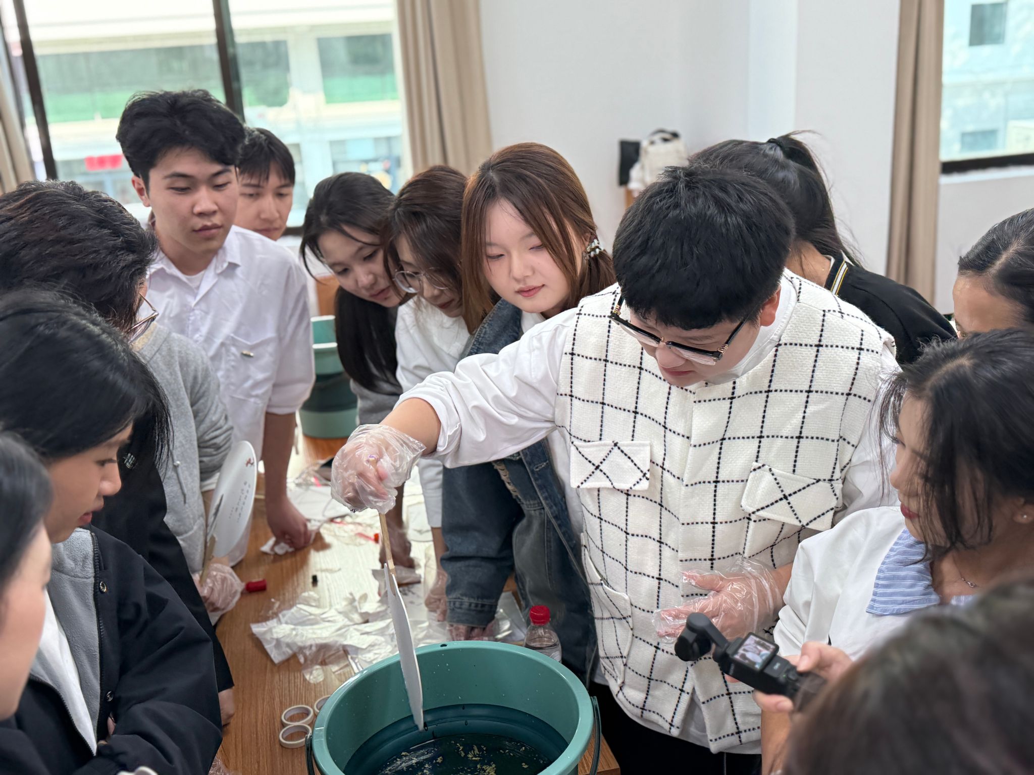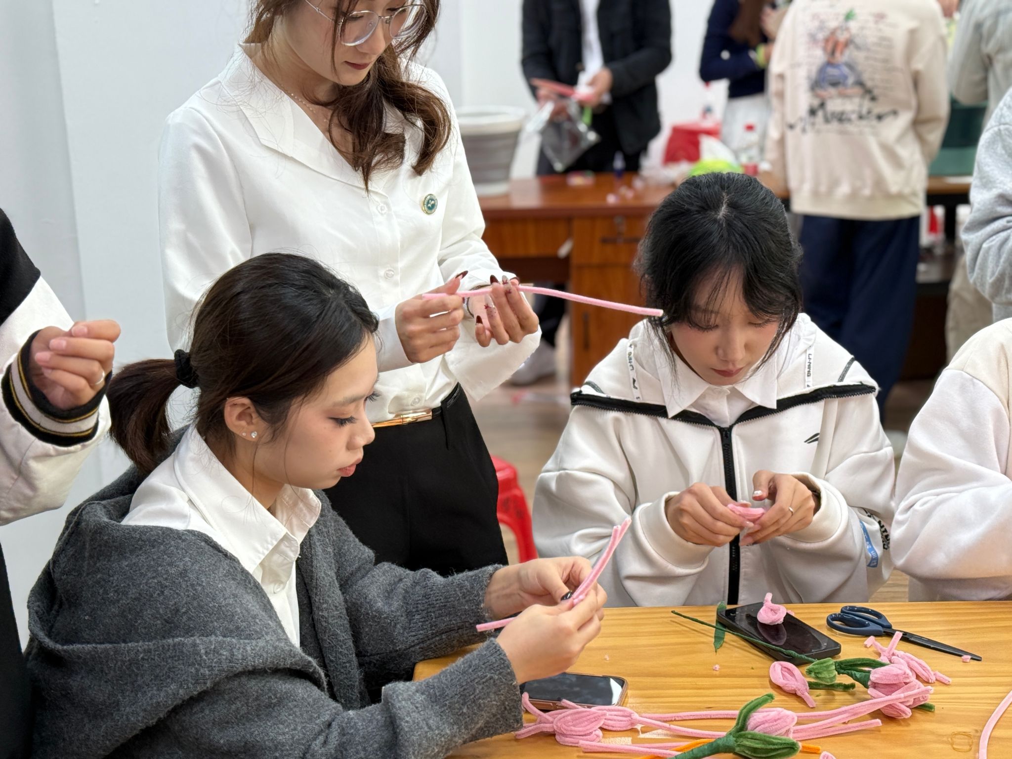 在美育微课堂中,两校师生体验飘漆扇制作、京剧发冠复原、扭扭棒花卉创作等手工项目,感受传统美学与现代创意的融合,增进校际情感联结。