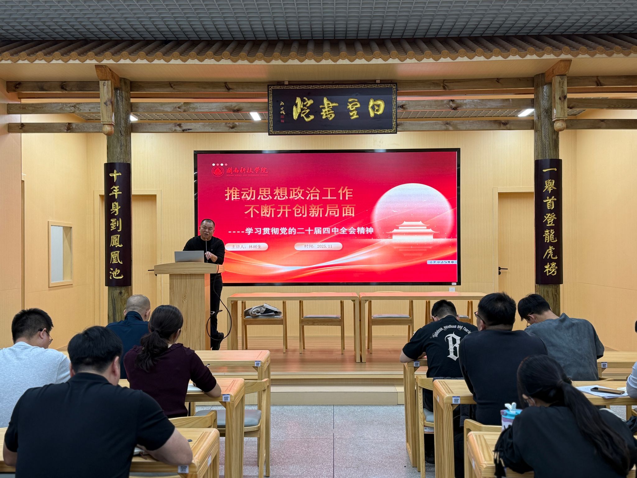 11月24日,校党委副书记林树生主持召开专题会议,为学工系统宣讲党的二十届四中全会精神。学生工作部(处)、校团委、各二级学院党组织书记及全体辅导员参加学习。