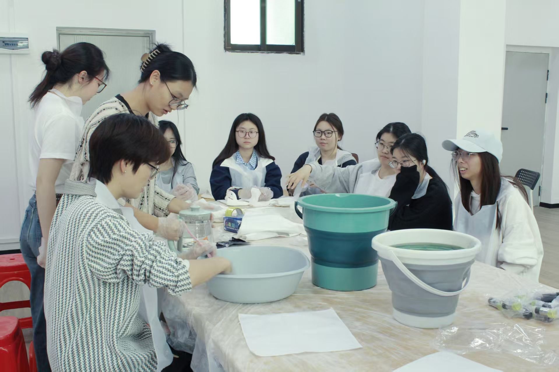 在“一站式”学生社区,艺术设计学院2025级服装与服饰设计专业(专升本)的同学们讲解与示范了扎染、拓印、传统纸鸢制作等非遗技艺,16名来自不同院系的同学亲手体验制作流程,深切感受中华优秀传统文化的艺术魅力与文化价值。