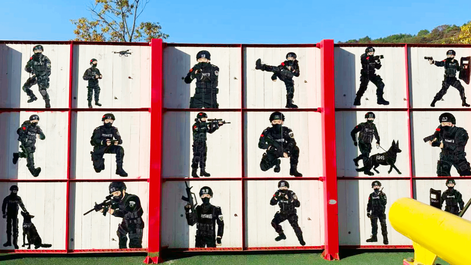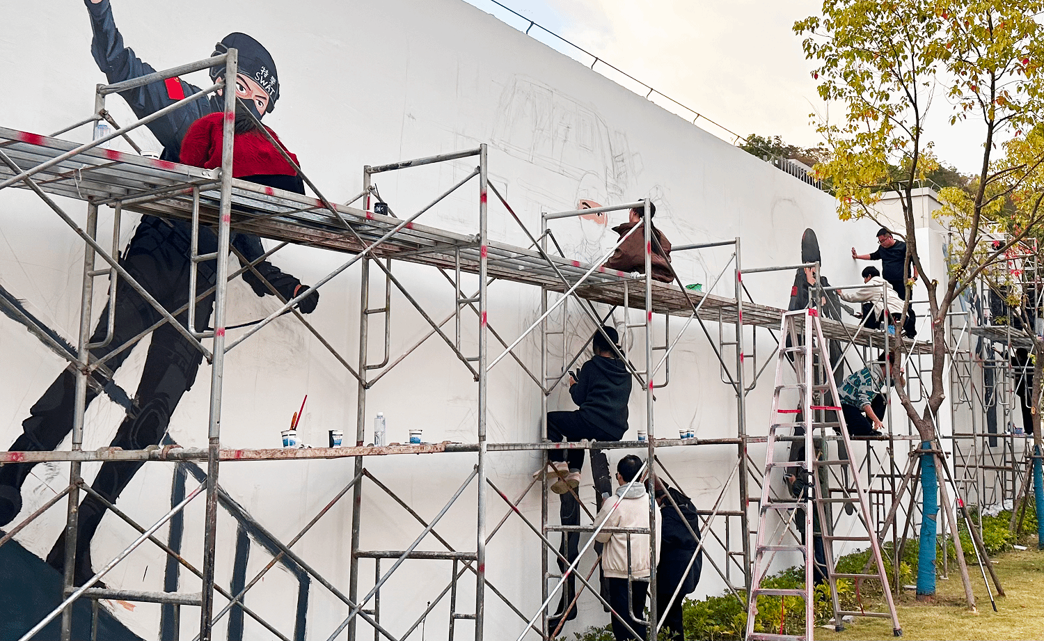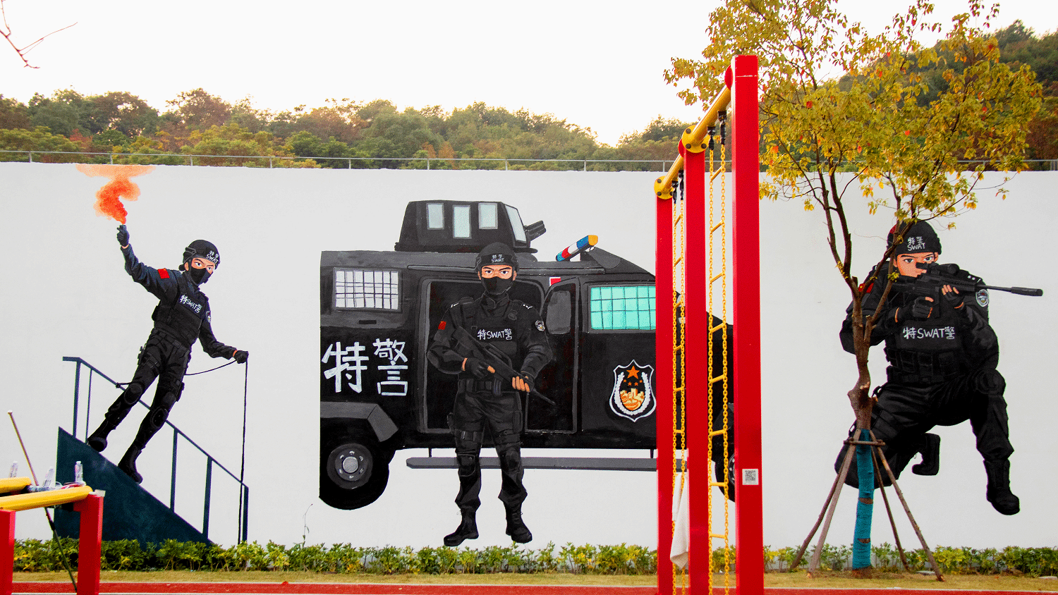 在巡特警反恐大队,实践队以“警校共绘平安画卷,艺术浸润忠诚警魂”主题,聚焦巡特警日常训练与执勤工作,历时三天完成130余平方米主题墙绘。作品以动态构图、鲜明色彩,生动展现特警队员训练执勤的飒爽英姿与服务群众的暖心风采,将“忠诚、奉献、担当”的警营精神融入艺术创作,为严肃的警营环境增添了人文温度。