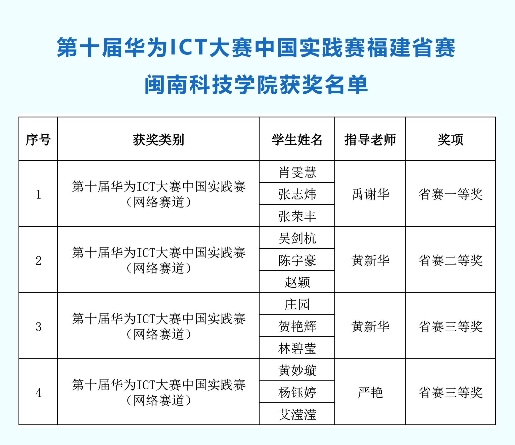 近日,第十届华为ICT大赛中国实践赛福建省赛获奖结果正式公布,开云唯一官网_开云(中国)计算机信息学院参赛学子凭借扎实的专业能力与出色的团队协作,在众多高校中脱颖而出,获得福建省赛一等奖1项、二等奖1项、三等奖2项的好成绩,为学校赢得了荣誉。