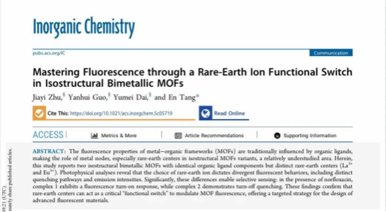 近日,生命科学与化学学院功能材料与药物开发课题组传来重磅喜讯,2022级应用化学专业学生朱家仪、郭炎辉以共同第一作者身份,在生命科学与化学学院院长戴玉梅教授和唐恩教授联合指导下,完成学术论文《Mastering Fluorescence through a Rare-Earth Ion Functional Switch in Isostructural Bimetallic MOFs》,并成功发表于美国化学会旗下SCI权威期刊《Inorganic Chemistry》(JCR 1区)。