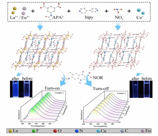 荧光性能分析显示,稀土离子的种类直接决定材料的发光行为:配合物1呈现配体中心发射(LC),配合物2则以配体-金属电荷转移(LMCT)主导发射。这一本质差异使得两种材料对诺氟沙星(NOR)表现出截然相反的传感响应:配合物1呈现荧光“开启”效应,配合物2则表现为荧光“关闭”效应。灵敏度测试结果表明,配合物1对NOR的检测限低至0.16 μM,配合物2的检测限为0.78 μM,且两种材料均具备优异的抗干扰性能,为诺氟沙星的精准检测提供了高效解决方案。