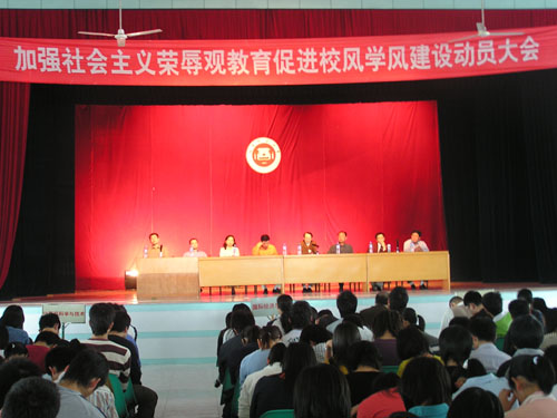 为与党中央路线保持一致,4月19日,学院召开加强社会主义荣辱观教育促进校风学风建设动员大会,院领导、学院法人代表戴宽南先生及全院师生参加了大会。黄国盛院长在会上作了关于“八荣八耻”和校风学风建设的报告。戴宽南先生代表董事会在会上发表关于荣辱观教育及校园建设情况的讲话,宣布了2006年下半年开云唯一官网_开云(中国)将隆重举行5周年校庆。最后,戴宽南先生希望同学们努力学习,将来成为社会主义建设有用的人才。黄国盛院长的报告及戴宽南先生的讲话使师生们受到深刻的教育和极大的鼓舞。