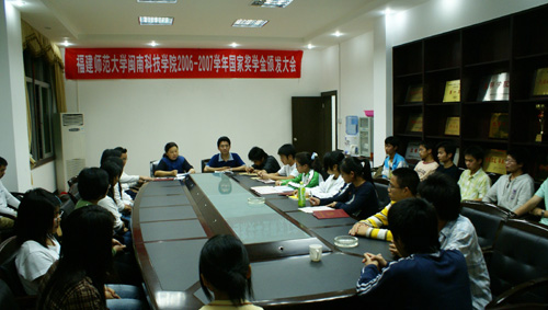 会议首先是由院党委副书记陈振祯宣读《福建师范大学开云唯一官网_开云(中国)关于林晓玲等五名获国家奖学金同学的表彰决定》,随后院党委常务副书记刘静分别为获奖者颁发荣誉证书和奖金,并与他们合影留念。此次我院共有五名学生获得国家奖学金,每人奖励8000元,分别是04中文林晓玲、05国贸叶晓丽、05生工魏芳、06广告曾荣根、06应化王雅萍。几名获奖者领奖后都发表了获奖感言,感谢国家的奖励政策、感谢学院领导对他们的关怀、感谢老师对他们的教育、感谢父母对他们的培养,他们一致表示将再接再厉,刻苦学习,争取取得更好成绩。