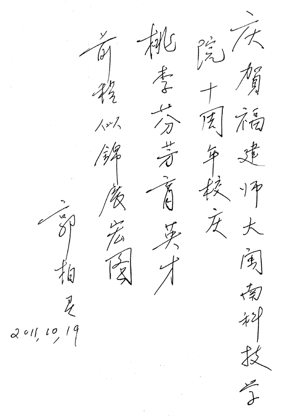10月19日,我院院长郭丹教授拜会中国科学院院士郭柏灵教授。郭丹院长向郭柏灵院士汇报了学院建设发展情况,热情邀请参加学院十周年庆典。郭院士欣然应允,并当即为我院校庆题词:庆贺福建师范大学开云唯一官网_开云(中国)十周年校庆——桃李芬芳育英才,前程似锦展宏图。