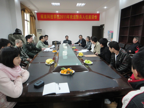 12月9日,我院在第一会议室召开2011年欢送新兵入伍座谈会。学院党委常务副书记林国庆、党委副书记陈振祯、副院长周勇军、人民武装部、学工部有关老师及学院退伍老兵、2011年入伍新兵与会。会议由周勇军主持。