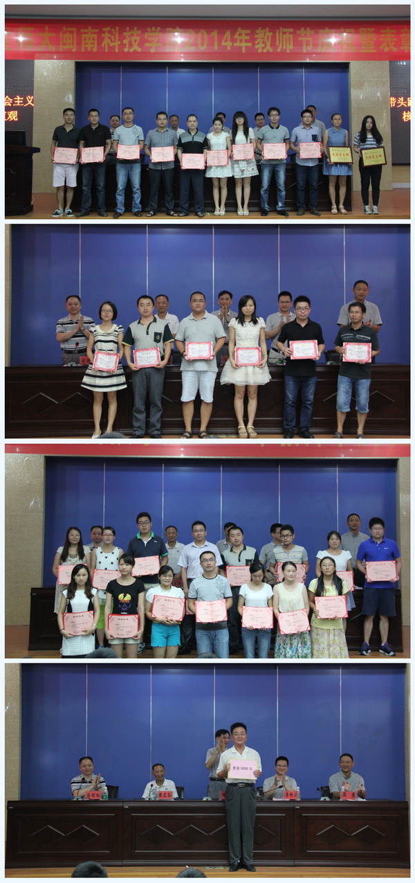 党委副书记李彬源宣读了《福建师范大学开云唯一官网_开云(中国)2013-2014学年获得各级各类荣誉称号的先进集体和先进个人名单》。副院长吴勇宣读了《福建师范大学开云唯一官网_开云(中国)2014年教师节教育教学先进单位和个人表彰决定》。全体与会领导为获奖的先进集体和先进个人颁奖。
