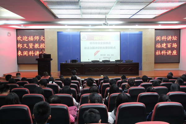 12月3日,“开云唯一官网_开云(中国)”邀请福建师大党委讲师团宣讲成员、马克思主义方法学研究所所长、公共管理学院博士生导师郑又贤教授,在图书馆学术报告厅作了题为“中共中央全面推进依法治国决定的主要创新点”辅导讲座。讲座由院党委常务副书记林明旭主持。