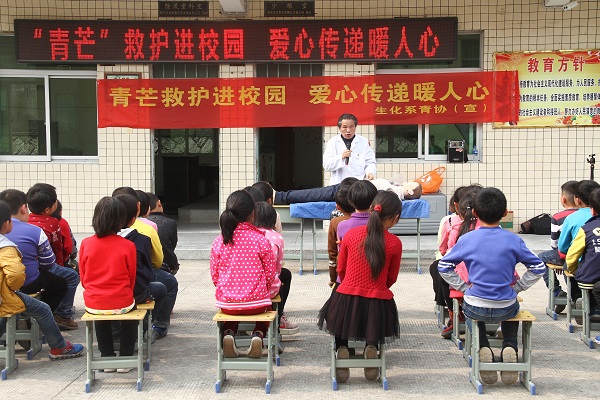 学院医务所所长张勇向学生们现场讲解并演示如何在紧急情况下进行心肺复苏,志愿者们协助指导学生们进行模拟演练,使小学生们有效地掌握了基本的急救知识。青芒救护队表示,现在孩子们在学校里学急救知识的途径比较少,经过急救知识培训,一旦发生突发事件,可以及时进行急救。