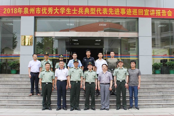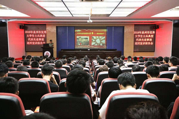 5月21日下午,由泉州军分区和南安市人民武部联合举办的泉州市2018年优秀大学生士兵典型代表先进事迹巡回宣讲报告会、征兵政策现场咨询活动在我院举行。泉州军分区政治工作处主任谢祥宁、干事胡苏楠,动员处参谋张景新、肖玉堉,南安市人民武部政委张纪伟,院领导林明旭、俞建群,学院征兵工作领导小组成员,以及辅导员、学生代表近350余人参加报告会。