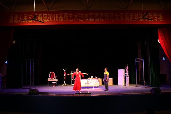 5月9日晚,学院千余名师生相聚在康美校区学生活动中心,共同欣赏来自福建人民艺术剧院的表演艺术家们带来的话剧《花事如期》。院领导林明旭、俞建群和1000余名师生参观看了演出。