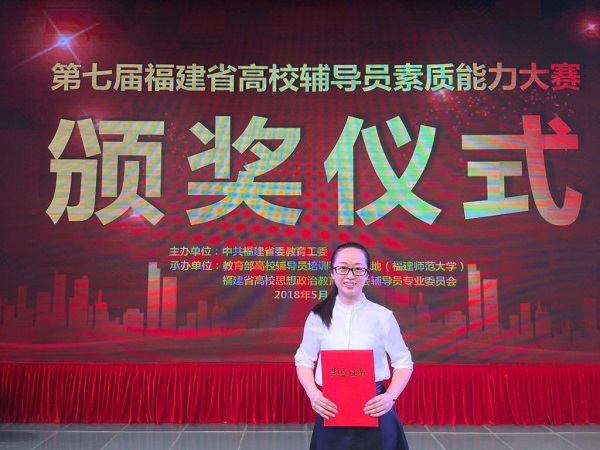 5月7日至8日,由中共福建省委教育工委主办,教育部高校辅导员培训和研修基地(福建师范大学)、福建省高校思想政治教育研究会辅导员专业委员会承办的福建省第七届高校辅导员素质能力大赛在福建师范大学落下帷幕。我院选派的辅导员傅莉玲在75名参赛选手中脱颖而出,荣获大赛三等奖。