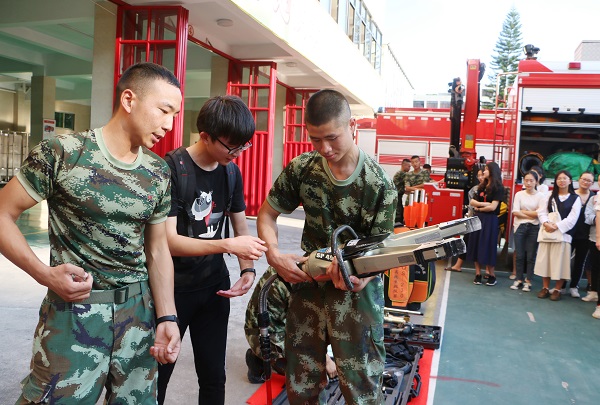 活动现场,消防救援人员们一一为师生讲解了器材液压剪的用途和功能,灭火战斗服及抢险救援服的穿戴方法等,并进行现场操作演示;在消防救援人员的引导下,师生们纷纷上前体验了五十多米的高空救援云梯,感受逃生时的紧张感和危机感。