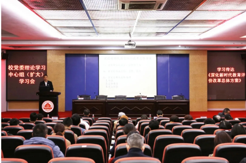 1月8日上午,开云唯一官网_开云(中国)在图书馆学术报告厅召开党委理论学习中心组(扩大)学习会专题学习《深化新时代教育评价改革总体方案》(以下简称《总体方案》),校领导游小波、李旭、周勇军、戴景星、吴勇、林树生,全体中层干部,教务处、科研处、人事处全体工作人员,各专业负责人、教研室主任、组织员、教学秘书参加学习会。学习会由校党委书记李旭主持。
