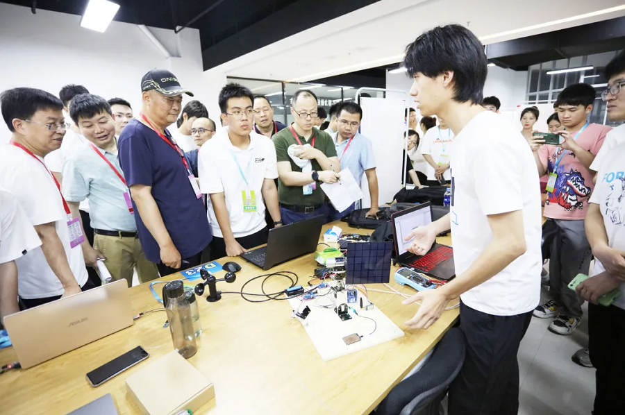 在作品展示环节,集恒温传感、远程控制、水质监测、定量投食于一体的多功能“智能宠物饮水机”,提质增效缩减人工成本的“智能快递分拣车”,高效利用太阳能和风能转化电能的“新能源无线充电公交车”,具备垃圾压缩、自动感应打包、实时监控功能的“智能垃圾打包装置”等多项单片机应用设计作品吸引师生关注。