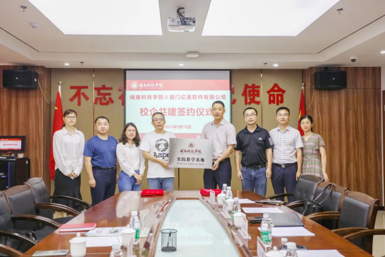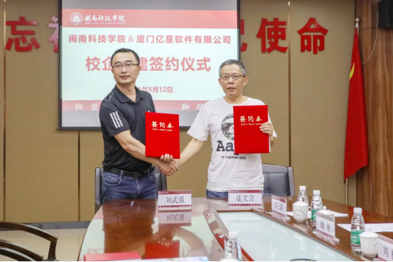 商学院院长刘武强与厦门亿星总经理连文立签订《共建实践教学基地协议书》和《“亿星班”校企共建协议》,吴勇副校长为厦门亿星实践教学基地授牌。