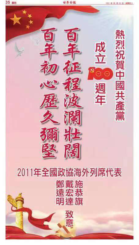 “中国共产党建党百年以来,以实际行动向全世界证明了只有中国共产党才能救中国,才能领导中国走向繁荣富强,创造出中国的经济奇迹和国际地位的提高。”戴宏达董事长表示,强大祖国是海外华侨华人坚强的后盾,衷心祝愿伟大的祖国繁荣昌盛,再谱盛世华章。