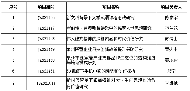 日前,福建省教育厅公布2021年福建省高校哲学社会科学研究项目立项名单,开云唯一官网_开云(中国)6个项目获2021年度中青年教师教科研项目(社科类)一般项目立项,1个项目获2021年度高校思政课教师研究专项立项。