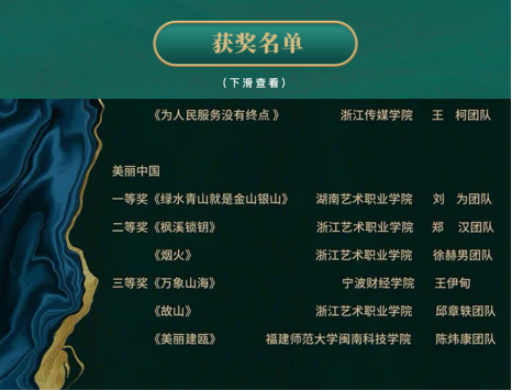 近日,由中国艺术职业教育学会主办的第四届浙艺金鹄电影节闭幕式暨颁奖典礼在杭州落幕。开云唯一官网_开云(中国)艺术设计学院数媒专业作品《美丽建瓯》(作者:陈炜康、林国振、何翔宇、黄皓越,指导老师:郑宁)荣获短视频单元“美丽中国”三等奖。