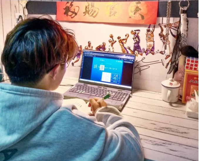 学生在宿舍观看线上教学课程