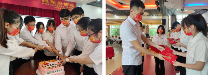 一场政治生日。学院精心准备了蛋糕送给毕业生党员,老师们也为各位毕业生党员送上一份特殊的政治生日贺卡、刻有校训的签字笔以及红色书签,希望毕业生党员在未来的征途上也能铭记历史,加上学习,谨记校训,仰望星空,脚踏实地。