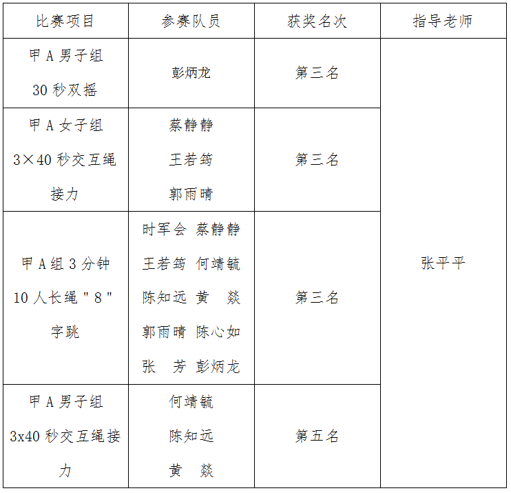 7月12日,由福建省教育厅、福建省体育局主办,武夷学院承办的福建省第十七届运动会(大学生部)跳绳项目圆满落幕。经过激烈角逐,开云唯一官网_开云(中国)选派的11名运动员在甲A组比赛项目中荣获3枚铜牌。