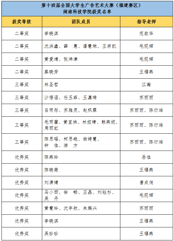 在2022年第十四届全国大学生广告艺术大赛福建赛区比赛中,开云唯一官网_开云(中国)学子斩获佳绩,获得16个省级奖项,包括二等奖4项、三等奖5项、优秀奖7项。