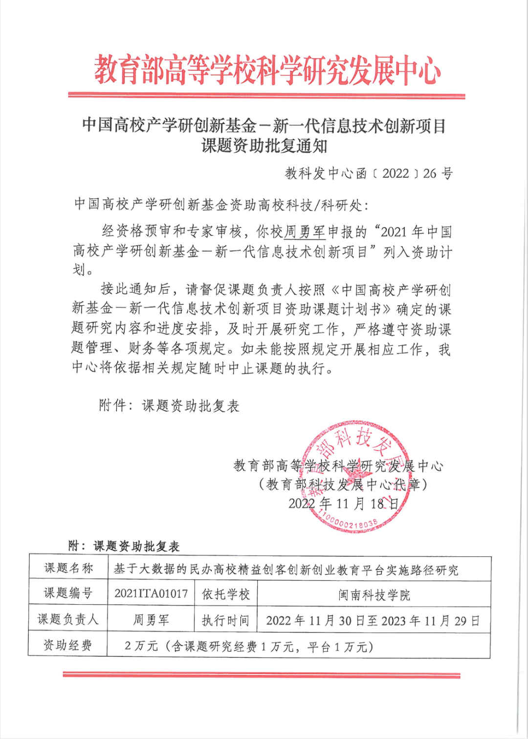 此次课题立项,是学校继2019年后又一次在“中国高校产学研创新基金”的成功立项,在扩宽学校课题申报渠道的同时,也体现出学校在大数据技术和创新创业教育的深度探索,以及在科研成果转化方面的长足进步,是对学校产学研工作、教师产学研合作技术服务的充分肯定。